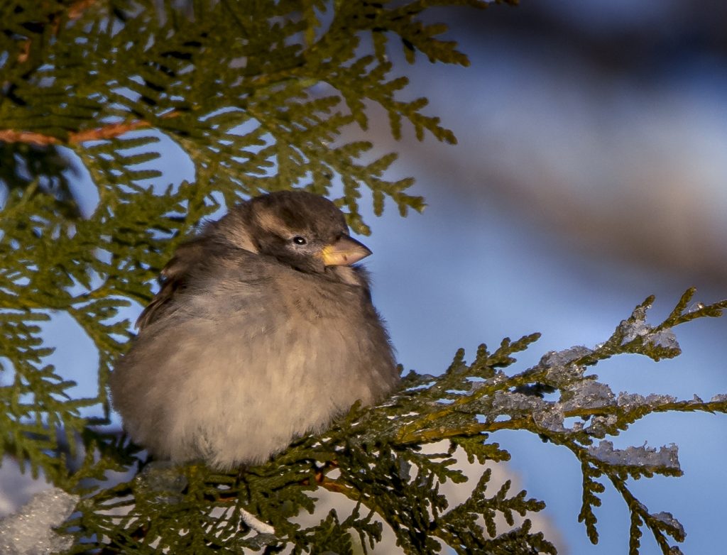 Thomas O hade en härlig spontanbild från julafton där glädjen över en lyckad julklapp framgick tydligt. ”Bättre tider” stod det på en byggnad som Annica fotograferat ute i Indalsälvens delta. Björn W dokumenterar hur bygget av den stora kombiterminalen fortskrider, just nu med spräng- och schaktarbeten. Björn hade även en bild på det fantastiskt vackra badhuset i Petersvik, som just nu ser ganska ensamt ut och med oljecisternerna i bakgrunden. Lennart W hade en bild på hustrun Annica ute på en riktigt vintrig promenad. ”En riktig vinterdag” kallade Patrik bilden från en myr, tagen för några dagar sedan. Temperaturen var -28 vid tillfället, så det var inte ett långvarigt fotograferande. Patrik efterfrågade tips om hur man motstår kylan och fick en hel del om både kläder, skor och handvärmare. Månadens sista bild stod Åsa för. En gråsparv som såg välmående ut och låg i stillhet i kylan. Totalt 12 bidrag till månadens bild denna gång.